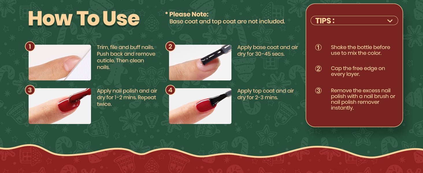 • 速乾性:このネイルポリッシュセットはUVランプを必要としません。クリスマスネイルポリッシュは、塗布後1~2分で自然乾燥します。当社の速乾性ネイルポリッシュは、クリスマスデートやギフト交換の前に、素早く指の爪を美しく整え、サロンレベルの絶妙なクリスマスネイルアートを実現します。
