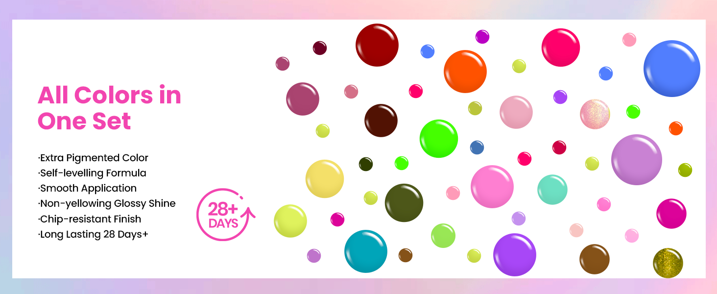 パッケージ内容:100色のジェルネイルポリッシュ(各ボトル5ml)+ベースジェル7.5ml X 2+トップコート7.5ml X 2+マットトップコート7.5ml X 1+ネイルファイルX 1+シェイパーネイルバッファーX 1+キューティクルスティックX 1+取扱説明書X 1+ビーズ描画ペンX 1。