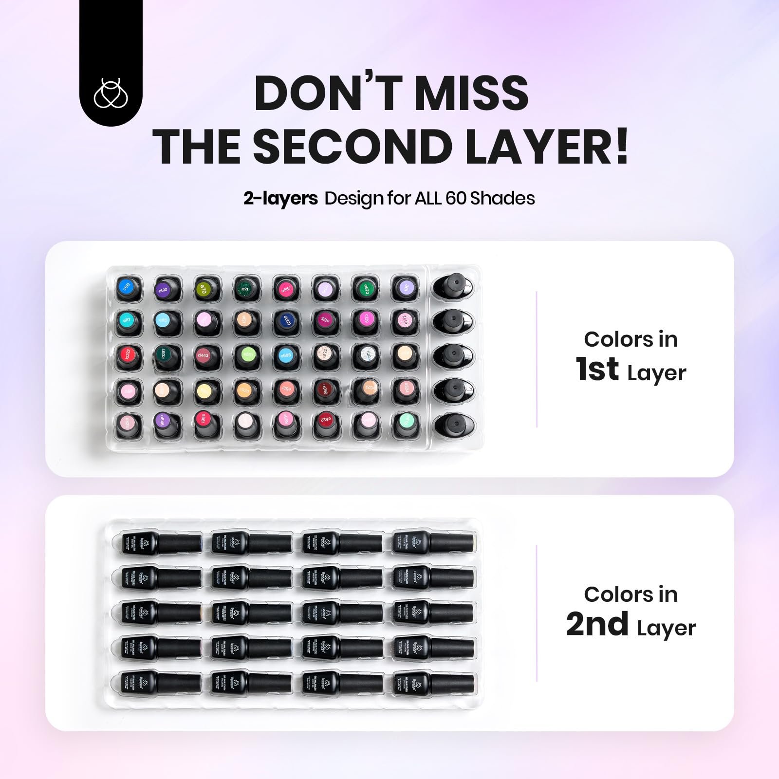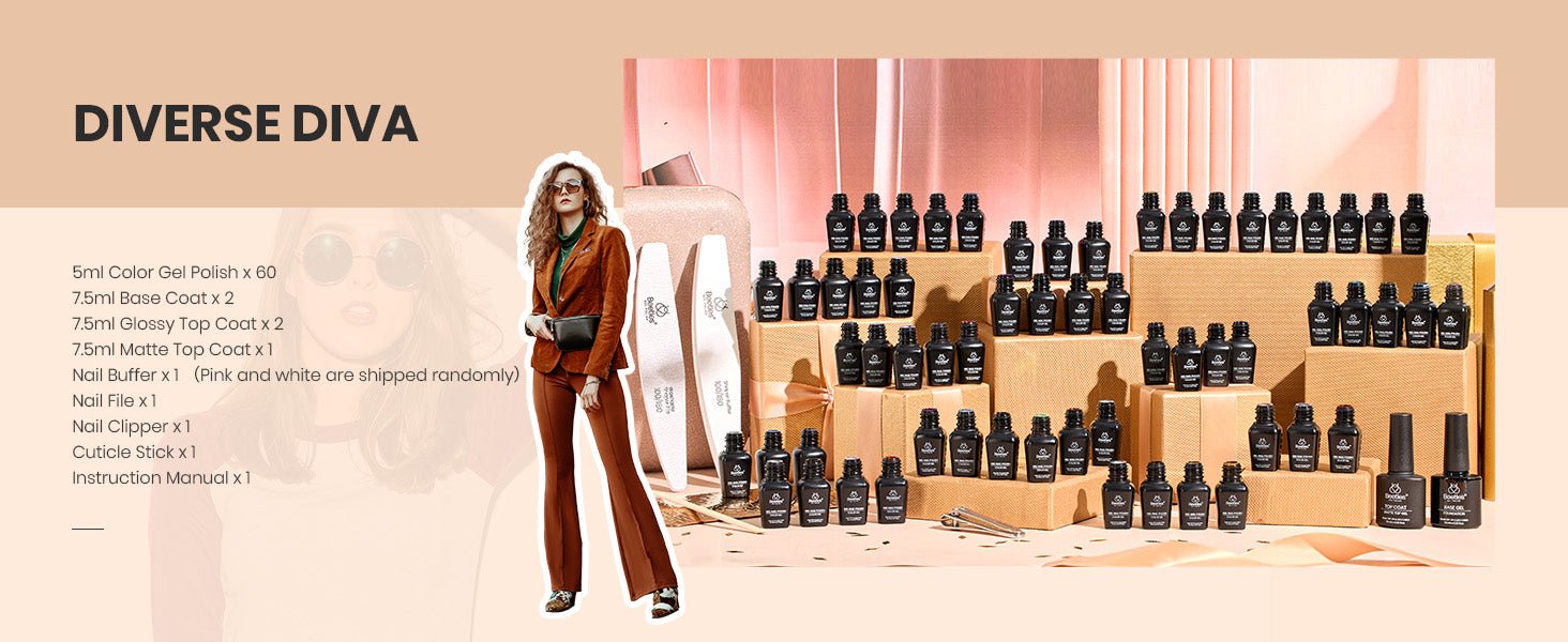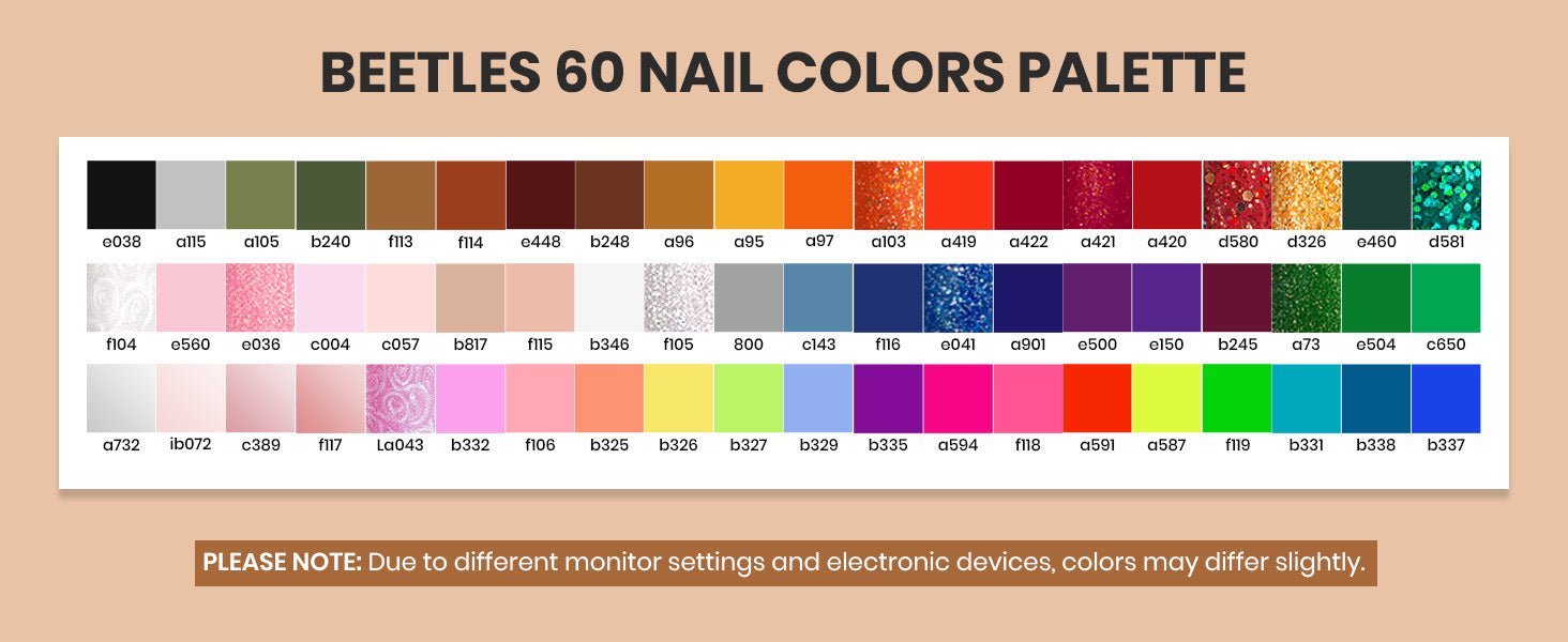 • 【60色ジェルネイルポリッシュセット】ビートルズ ジェルネイルポリッシュキットには、季節を問わずお使いいただけるよう厳選された60色のネイルカラーが入っています。ジェルネイルポリッシュセットには、5ml×60色のジェルネイルポリッシュ、7.5ml×2のベースコート、7.5ml×2の光沢トップコート、7.5ml×1のマットトップコート、その他のネイルツールが含まれています。完璧なネイルアートを作成するために、さらに多くのカラージェル、ベースコート、トップコートを提供しています。