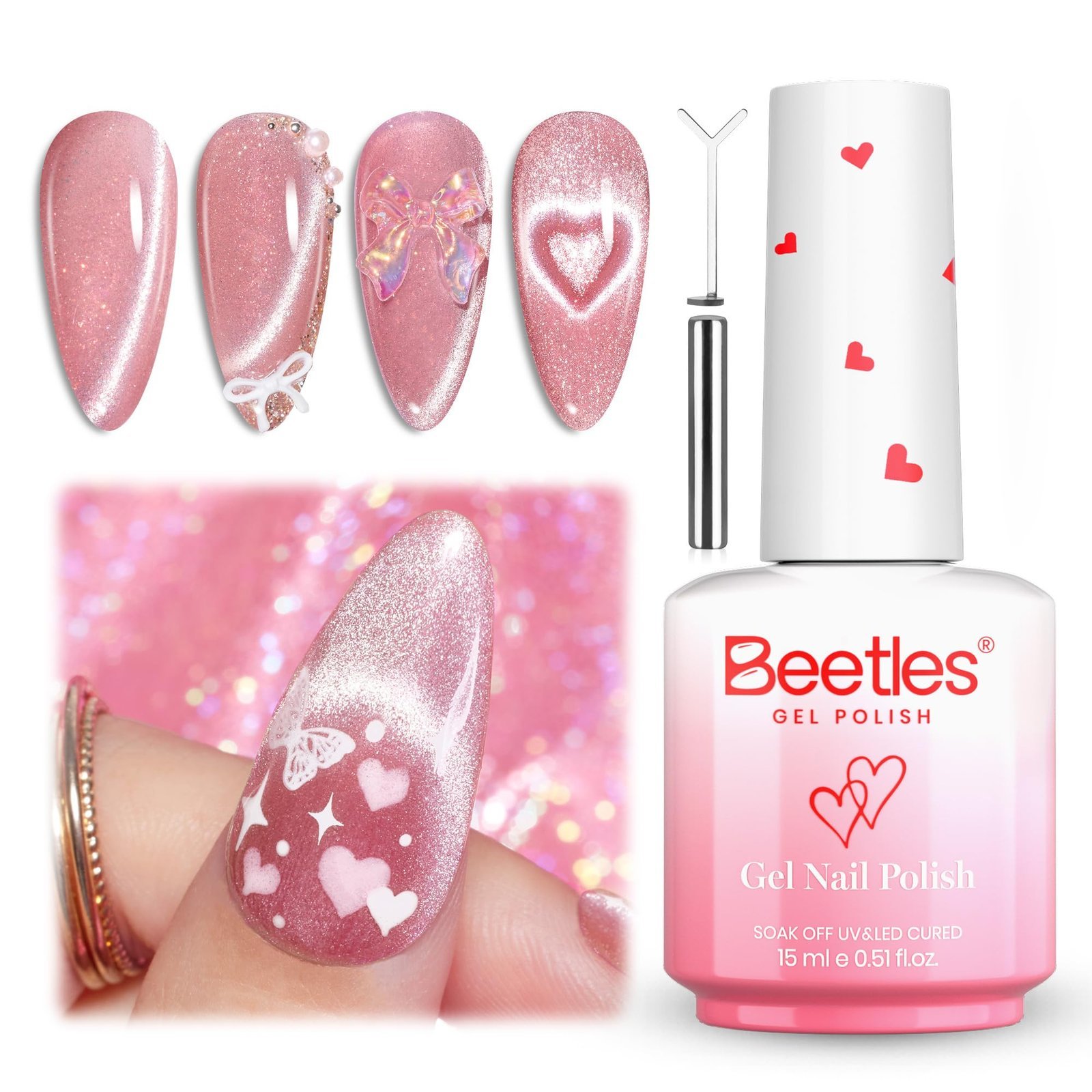 • 【ロマンティック ハートビーム ピンク キャット アイ ジェル ポリッシュ】バレンタインデーのためにデザインされたこのソフト ピンクのキャット アイ ジェルは、光によって変化する繊細なマグネットのような輝きを放ち、ロマンチックでエレガント、そしてたまらなく目を引きます。ハートをテーマにしたボトルとバレンタイン風のパッケージが特徴のこのジェル ポリッシュは、愛する人へのプレゼントにも、自分へのご褒美にも最適です。