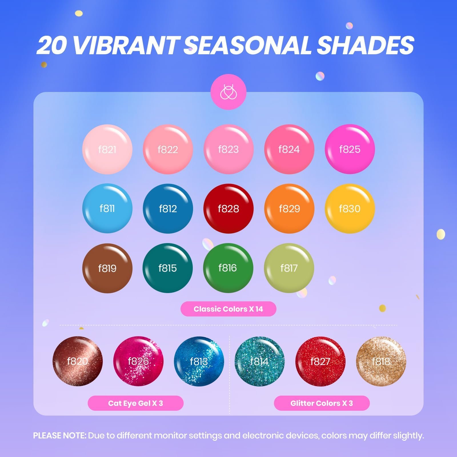 豊富で多様なネイルアートキット: このバリューギフトボックスには、夏と秋の季節向けにデザインされた20色のネイルアートジェル、ソリッドカラージェル*14、キャットアイジェルポリッシュ*3、グリッタージェルポリッシュ*3が含まれています。このセットには、ベースジェル、ビルダーネイルジェル、ネイルグルー、ラインストーングルージェル、プレスオン、ネイルステッカー、ネイルアートダイヤモンド、ネイルツールも装備されています。シンプルな単色マニキュアでも、ゴージャスに装飾されたマニキュアでも、簡単に実現できます。